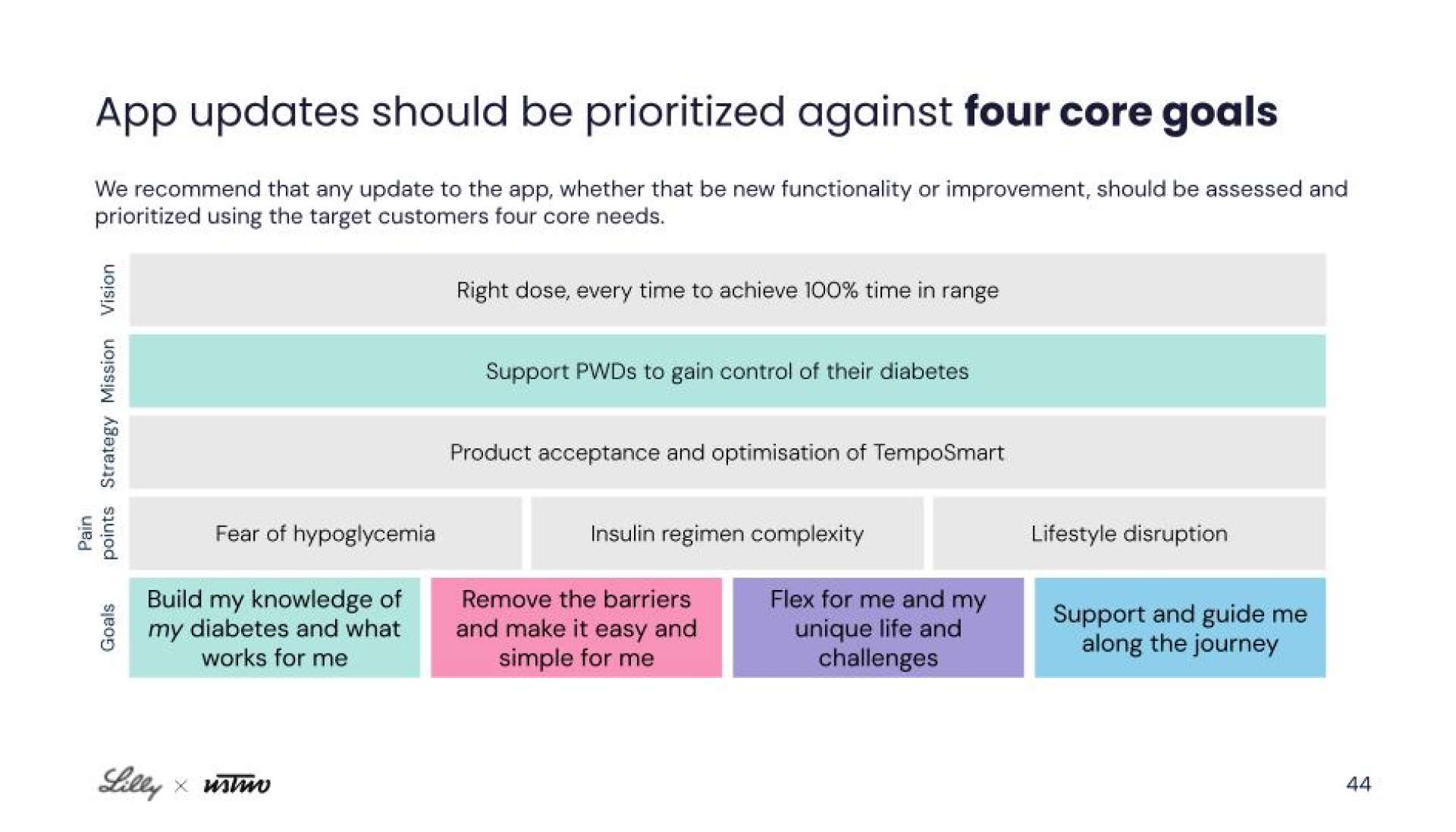 Eli Lilly partnered with Ustwo to address the challenges facing the Tempo Smart diabetes management app. Using a white-label approach, Tempo Smart suffered from feature bloat, a lack of strategic focus, and a reactive, non-customer-led prioritisation process. The app aimed to be a one-size-fits-all solution, neglecting the core needs of people living with diabetes.